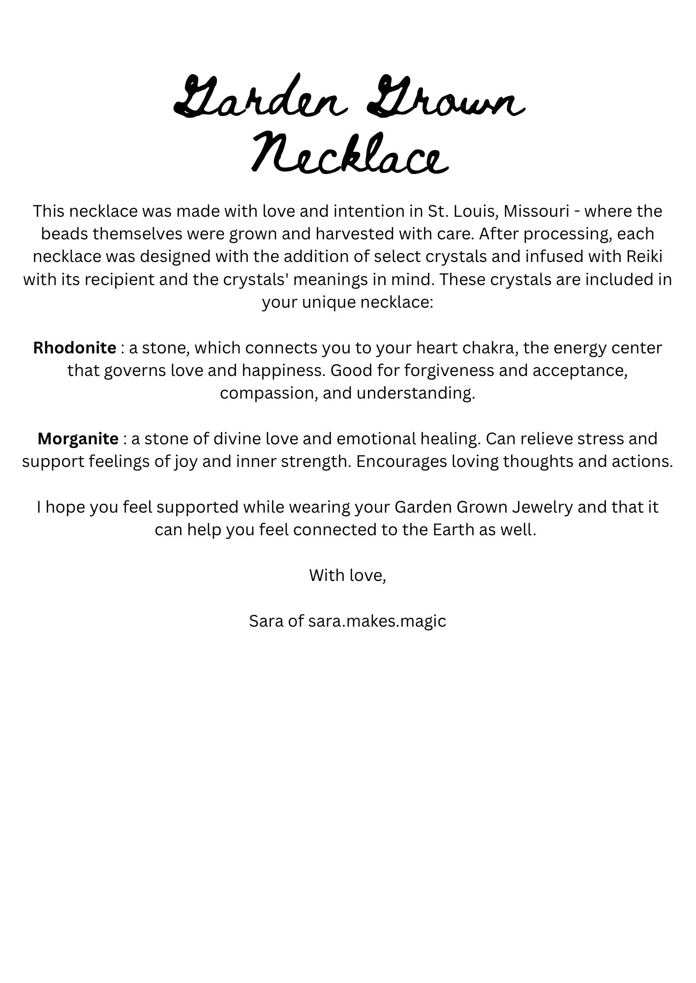 Each Garden Grown Necklace has crystals added and is infused with Reiki and the intentions of the crystals. A paper with which crystals are included and their meaning will also be included.