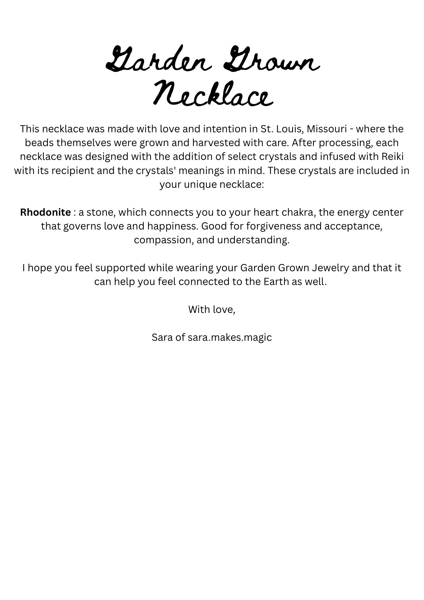 Each Garden Grown Necklace has crystals added and is infused with Reiki and the intentions of the crystals. A paper with which crystals are included and their meaning will also be included.